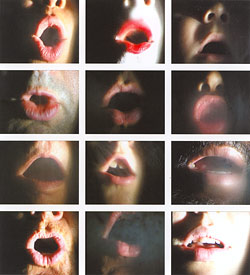 | Ars Mundi, 1997 Ars Mundi was originally developed as a proposal for an art-in-architecture project for Deutsche Telekom. Kutscher showed images of 16 different, oversized mouths on 16 monitors arranged in four rows of four each in a metal shelf unit. The mouths breathed onto a pane of glass that merged in the images with the surface of the monitor screen. They belonged to 16 people of different genders and ages, skin colours and nationalities. The breath coming from each mouth had its own particular consistency and its own rhythm, aspects of individuality that were evident both in form and in movement. At regular intervals the mouths emerged from the darkness of the screen background, only to recede into it again. The breathing actions created a constant rhythm of coming and going. In certain sense, the video medium was given warmth and rendered more human by the breathing mouths. In this work, Kutscher explored the theme of an "art of the mouth" as a kind of world art. Air, the immaterial substance that links everything together and of which everyone partakes, becomes a symbol of a globally united humanity. Peter Forster |