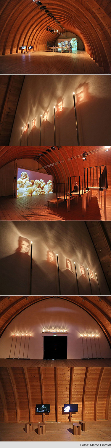 CinemaczzSchafhof – Europäisches Künstlerhaus Oberbayern Freising, 9. April ‒ 5. Juni 2016 » www.schafhof-kuenstlerhaus.de Über Vollrad Kutschers Porträtbilder Von Michael Stoeber Meine Damen und Herren, ich hatte heute Morgen das Privileg und das Vergnügen mit Vollrad Kutscher den schönen Dom von Freising besichtigen zu können. Wir wohnen dieser Tage, in denen Kutschers Ausstellung vorbereitet wurde und an diesem Abend die Eröffnung stattfindet, beide auf dem Domberg. Vor allem die alte romanische Krypta des Doms mit ihrem Wald aus Säulen und Rundbögen fesselte Kutschers Aufmerksamkeit und erregte seine Bewunderung. Nicht eine Säule dort ist wie die andere. Mit jeder wandelt sich das Dekor- und Figurenprogramm, das in einer Zeit entstand, als Kunst, Technik und Handwerk noch eine Einheit bildeten und keine spezialisierten Disziplinen darstellten. Eine solche Auffassung künstlerischen Schaffens ist durchaus nach dem Geschmack Vollrad Kutschers. Er ist ein Künstler, den man in Frankreich ehrenvoll einen Touche à tout nennt. Gemeint ist damit ein Künstler, der in vielen unterschiedlichen Medien arbeitet. Kutscher ist jemand, der malt und zeichnet, fotografiert und filmt, Objekte und Installationen fertigt, choreografiert und Performances entwirft und selbst auch in ihnen agiert – und alles auf hohem Niveau. In Deutschland, wo der Spezialist hohes Ansehen genießt, steht man solchen Generalisten eher misstrauisch gegenüber. Was – nicht nur hierzulande – oft auch Auswirkungen auf den Kunstmarkt und den Marktwert eines Künstlers hat, weil hinter solcher Vielseitigkeit nicht selten eine spezifische Signatur verschwindet, die sich dem Bewusstsein des Publikums einprägt. Und die ist in der Regel als eine Art wieder erkennbares Markenzeichen gut für die Verkäuflichkeit seiner Werke. Die Amerikaner sprechen in diesem Zusammenhang von Signature Art. Eine solche Signaturkunst hat Vollrad Kutscher nie geschaffen. Und dennoch gibt es auch in seinem vielgestaltigen Werk gewisse wiederkehrende und wieder erkennbare Konstanten. Sie tauchen ebenfalls in dieser Ausstellung im Europäischen Künstlerhaus auf, die sein Leiter Eike Berg kompetent kuratiert und die seine Mitarbeiter präzise aufgebaut haben. Eine solche mediale Konstante sind die „Leuchtenden Vorbilder“, die Sie, meine Damen und Herren, links von mir an der hinteren Wand des Ausstellungsraumes sehen. Sie erscheinen in Kutschers Werk als ein work in progress durch die Zeit hindurch nicht nur immer wieder, sondern sie sind auch eine Art Alleinstellungsmerkmal des Künstlers, gibt es doch niemand im Bereich der Lichtkunst, der in ähnlicher Weise wie er solche Porträts gefertigt hätte. Wie ein mittelalterlicher Miniaturenmaler malt er sie – anfangs direkt auf kleine Glühlämpchen – heute auf kleine, Halogenbirnen umschließende Glaskappen. Das Halogenlicht projiziert die Bilder auf die Wände hinter ihnen, wo die Porträts ein eher schattenhaftes Dasein führen. Es steht in eklatantem Widerspruch zum euphorisch ihr Leuchten und Strahlen betonenden Titel der Werkserie. Da diese Bilder aber überhaupt erst durch Licht und Elektrizität an Wirklichkeit gewinnen, sei darauf hingewiesen, dass sie – quasi en passant – in ihrer Erscheinungsweise als moderne Wiedergänger des uralten Gründungsmythos der Malerei zu gelten haben. Der erzählt, dass die Malerei folgendermaßen in die Welt kam: Ein sich leidenschaftlich liebendes Paar stand vor der Trennung, weil der Liebhaber, ein junger Mann, in den Krieg ziehen musste. Daraufhin hielt die Geliebte eine Fackel vor sein Gesicht, deren Schein seinen Schatten an die Wand warf, wo sie ihn zur Erinnerung für sich mit schwarzer Kohle festhielt. Liebe und Krieg oder allgemeiner Eros und Thanatos, Tod und Liebe, sind durch den Gründungsmythos der Malerei also von Anbeginn an, eng miteinander verbunden. Nicht anders in den „Leuchtende Vorbildern“. Nicht nur durch ihr schwaches, moribundes Licht und ihre sepiahafte Einfärbung lassen sie an Vergänglichkeit und längst Vergangenes denken. In der Regel sind es auch immer Tote, die Vollrad Kutscher in seinen Werken auferstehen lässt, zumindest für die Dauer, in welcher der Strom fließt, der sie erleuchtet. In den Werkreihen, die Sie hier sehen, stattet der Künstler in der Mitte der Wand jenen Wissenschaftlern und Erfindern Dank ab, ohne deren Großtaten seine künstlerischen Werke heute gar nicht möglich wären. Wir sehen von links nach rechts in der zeitlichen Abfolge ihres Auftretens und Wirkens vom sechzehnten bis zum Ende des neunzehnten Jahrhunderts einige all jener, die maßgeblich zur Entdeckung und Entwicklung der Elektrizität beigetragen haben. Angefangen mit Gilbert über Watts, dem Erfinder der Dampfmaschine, Ampere, Volta, Ohm bis hin zu Edison, dem Erfinder der Glühbirne. Tempi passati. Vorbilder mögen sie gewesen sein – und für manche, die sich mit ihnen beschäftigen, sind sie es sicher immer noch. Vor allem durch die Leidenschaft und Hingabe, mit der sie ihre Sache vorangetrieben und zugleich etwas für die Menschheit getan haben. Vergessen sind von den meisten gleichwohl. Das trifft in vielleicht noch stärkerem Maße für die Schauspieler und Schauspielerinnen zu, deren Porträts sie links und rechts von der Mitte sehen. Das Wort vom Mimen, dem die Nachwelt keine Kränze flicht, bringt es auf den Begriff. Wobei es sich mit den Filmschauspielern noch etwas anders verhält als mit den Theaterschauspielern. Erstere erleben mit jeder Wiederaufführung eines Films, in dem sie mitspielen, eine Art Wiedergeburt auf Zeit. Und dennoch heißt solche Filme anzuschauen auch, dem Tod bei der Arbeit zuzuschauen, sieht man sie doch im Bewusstsein und mit dem Wissen, dass die in ihnen Agierenden längst nicht mehr leben und bereits unter den Toten weilen. Das ist, wie gesagt, bei allen hier präsentierten Akteuren der Fall. Natürlich wird bei vielen Betrachtern und bei vielen der hier Anwesenden allein