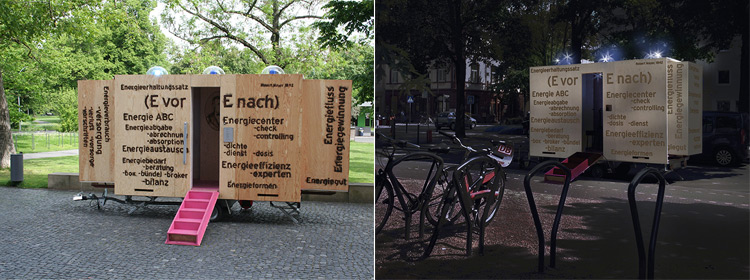| ENERGIE – BÖXLE Das summende, brummende Energie-Böxle Städtische Museen Heilbronn, 05.05. - 30.9.2014 Das Energie-Böxle ist ein weiteres Beispiel der von mir entwickelten "Porträtinstallationen" und bezieht sich auf Robert Mayer. Aussen ist die Box bedeckt von Energiebegriffen und seinem Energieerhaltungssatz von 1842. Sie sind mit Hilfe von Wärmeenergie - traditioneller Brandmalerei - in die klare, architektonische Holzstruktur eingebrannt (MuseumsBoX von Anke Wünschmann / Achim Wollscheid). 3 Blaulichter blitzen unter den Hauben auf dem Dach, wenn das Böxle geöffnet und auf volle Länge ausgezogen ist. Standorte: Experimenta – Kunsthalle – Rathaus – Deutschhof |