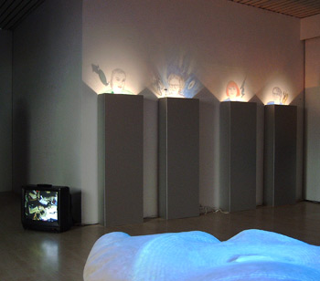 | Die von Vollrad Kutscher Anfang der 80er Jahre entwickelte Form der Porträtinstallation ist eine Fortführung und Erweiterung der klassischen Porträtdarstellung, aber neben bekannte Materialien und Techniken treten computerbearbeitete Bilder, Lichtprojektionen, Videosequenzen, Fotografien, Klang, etc., die den Betrachter gleichzeitig im Raum umgeben. Die Definition vom Gegenüber als autonomem Individuum - als Unteilbarem- wird in der Porträtinstallation durch das heteronome Multividuum abgelöst. Zentrales Element der Porträtinstallation "ESCAPE -Peter Weibel" ist eine geschwungene Form "Leib" genannt, mit der dazugehörigen Videoprojektion "Swinging drop". Das Video zeigt einen Wassertropfen, der auf einer Herdplatte tanzt und langsam verkocht. 10 "Leuchtende Vorbilder" - auf Glaskappen gemalte Miniaturporträts berühmter Persönlichkeiten- als Licht- und Schattenbilder auf die Wand projiziert, verweisen auf das geistige Profil Peter Weibels. Vier "Lichtporträts" seiner engsten Vertrauten treten hinzu. Das Licht fällt durch verzerrte Porträtmalereien auf Glasscheiben (Anamorphosen), lässt aber unverzerrte, farbige Abbildungen an der Wand über den Sockeln erscheinen. Das Foto eines Hautausschnittes mit einer eingewachsenen Escapetaste, sowie eine sich drehende Büste auf einem Sockel mit der Videoprojektion des sich drehenden Modells sind weitere Elemente. Für 10 verschiedene Endlosvideos schuf Hubert Machnik eine spezielle Komposition, die den Betrachter umgibt. Die einzelnen Soundtracks sind so aufeinander abgestimmt, dass sie sich bedingt durch Wiederholung und Verschiebung der Klangelemente, immer wieder neu zu einem Gesamten zusammensetzen. Die Videosequenzen sind haut- und körpernah in Weibels unmittelbarer Umgebung entstanden. Einige beziehen sich auf eine Rasurperformance Weibels aus den 70ern. Ihre Arbeitstitel sind: Weibeltisch, Weibelschlaf, Heldenbrust, Rasurgott, Bürokopf, Pinsel, Tropfen-Sterne, Tenniskopf, Drehkopf, Hauch. Bedeutende Veränderungen in unserer Welt führten in der Vergangenheit zu neuen Auffassungen von uns selbst und damit auch zu neuen Ausdrucksformen und Techniken in der Kunst. In der Porträtinstallation ESCAPE steht Peter Weibel als Modell für das aktuelle Spannungsverhältnis zwischen realer und virtueller Welt, Materialität und Immaterialität, Körper und Geist, irdischer Begrenztheit und der Vorstellung von ewiger Information. |