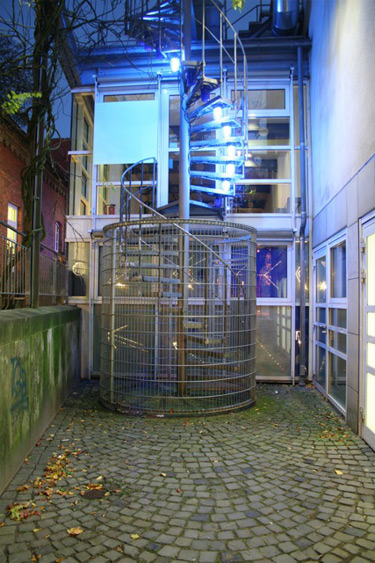 | Fluchttreppe Vollrad Kutschers „Lichtspieltheater“ am » Bahnhof Celle und die "Fluchttreppe" am Museum. Am Museum blitzen 17 spiralförmig an der Fluchttreppe montierte, blaue Signalleuchten hektisch auf, wie man sie aus dem Alltag von Feuerwehr-, Polizei oder Krankenwagen kennt. Sie beleuchten ein gegenüber liegendes Quadrat, das mit lichtspeichernder grünlicher Farbe bedeckt ist. In den Leuchtpausen verblasst es allmählich, bis der Tanz der Blaulichter wieder beginnt. Das quadratische Bild, seit Malewitsch eine Ikone der Kunstgeschichte, befindet sich hier im steten Dialog mit banalen, industriellen Leuchtkörpern. Beide Arbeiten sind bestimmt durch die Elemente: Bewegung, Zufall, Licht, Farbe, Zeit, Raum, Atmosphäre. Sie heben die Wege, das architektonische Element Fluchttreppe sowie die Betonwände der Unterführung heraus und transformieren sie in Bühnenelemente. Sowohl die zufällige, hektische Schaltung der, aus dem Alltag bekannten Blitzleuchten (Fluchttreppe) mit ihrem ruhig verblassenden, lichtspeicherndem Quadrat als Partner, wie auch die Interaktion mit dem Betrachter/ Passanten in der Unterführungsinstallation - dort noch verstärkt durch die Klanginstallation - werden zu Bestandteilen stets variierender Lichttheaterstücke. |