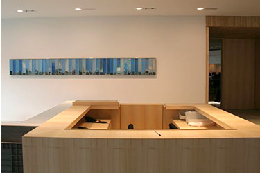 Das neue Landtagsgebäude wirkt vor allem durch die Fensterschlitze in den Außenwänden originell und herausgehoben. Die aufgelockerte Fassadengliederung kann bei Sonnenlicht zu spannungsreichen Licht- und Schattenspielen im Innern führen, während das Kunstlicht nachts attraktive Lichtpunkte nach außen strahlt. Auch im „Herz“ des Gebäudes, dem Plenarsaal sind diese besonderen Elemente im oberen Besucherbereich rundum sichtbar. Die bewusste Gestaltung des Lichtes durch die Architekten sind Ausgangspunkt für meinen Gestaltungsvorschlag: Himmel über Hessen „Licht – gestalten“ Plenarsaalwand (Vorderseite) a.) Hoheitszeichen Zentral in der Mitte der Wand hinter dem Präsidium befindet sich eine rotgetönte, lasierte Abbildung des hessischen Löwen im Ausschnitt auf der Holzwand aus hellem Ahorn. Der Kopf des Löwen und seine Pranken erscheinen hinter Präsidium und Redner als Erkennungszeichen des Ortes. Weitere durch die Vergrößerung ornamental wirkende Ausschnitte des hessischen Löwen sind links und rechts davon angeordnet und setzen sich teilweise auf der Rückwand fort. Er steht als Hoheitssymbol für die besondere Rolle des Versammlungsortes. b.) Himmel über Hessen Aktuelle Darstellungen hessischer Landschaften: Das vom Plenarsaal im oberen Bereich sichtbare architektonische Prinzip mit den Fensterschlitzen wird in der Plenarsaalrückwand aufgenommen und variiert. 8 Fensteröffnungen der selben Maße sind im lockeren Rhythmus links und rechts in den ornamentalen Ausschnitten des hessischen Löwen im oberen Bereich der Rückwand angeordnet. Auf den ersten Blick scheinen sich darin nur schmale, aquarellartige Streifenbilder zu befinden. Beim Betrachten aus der Nähe erkennt man die Signaturen und Lebensdaten großer hessischer Persönlichkeiten aus dem Kultur- und Geistesleben, sowie aktuelle Orts- und Zeitangaben. Zur Malerei: Ausgangsmaterial für diese Bilder sind Fotografien, die direkt an den jeweiligen Wirkungsstätten hessischer Persönlichkeiten gemacht wurden. Die Kamera wurde vor Ort in eine rasche Bewegung entlang des Horizontes geführt. Daher bestehen diese Fotografien nur aus Farbstreifen. Sie zeigen die Farben des Himmels sowie Landschafts- oder Gebäudeteile. (Beispiel: Goethehaus Frankfurt). Das entstandene Bild ist bei aller Abstraktion eine Zusammenfassung des am historischen Ort zum Zeitpunkt der Aufnahme konkret vorhandenen Lichtes und der spezifischen Farbigkeit. Die von Geschwindigkeit und Bewegung bestimmte Landschaftsfotografie wird aus Haltbarkeitsgründen, aber auch zur Brechung des Mediums in Glasmalerei übersetzt. (Eine Variante mit einer dichten Reihe von je 25 Bildern links und rechts vom Löwen wäre denkbar. Die Originalfotoserien befinden sich in solcher Anordnung als vergrößerte Kontaktstreifen auf der Rückwand.) c.) Licht - gestalten Im Mittelpunkt der Demokratie steht der Mensch. Die auf ihn bezogenen Tätigkeiten in diesem Raum und das Menschenbild erhalten daher eine besondere Gewichtung. Langsam aufleuchtendes Licht hinter den zarten Landschaftsbildern von hessischen Orten und Himmeln lässt das lebensgroße s/w Porträt der dort einmal tätigen hessischen Persönlichkeit im Anschnitt und leicht unscharf durchscheinen und die Malerei zurücktreten. Die Zeitdauer der Anwesenheit der Personen, ihre Erscheinung sowie ihr Verschwinden ist variabel programmiert. Die Bilder sind in sich nicht bewegt und haben keine beleuchtende Funktion. Die Porträts verweilen in wechselnden Konstellationen und begleiten als stumme Zeugen der Vergangenheit das Geschehen im Plenarsaal. Ihr Erscheinen entspricht dem Rhythmus der täglich wechselnden Anwesenheit der Abgeordneten im Plenarsaal und dem sanften Wechsel des nach innen fallenden natürlichen Lichtes außen. Die Bildfenster öffnen den Blick nicht nach Innen oder Außen, sondern in den historischen Raum. Das Geschehen, die Auftritte und Diskussionen im Plenarsaal passieren also gleichsam unter den Augen der projizierten großen Geister der hessischen Kultur- und Geistesgeschichte. Goethe, Büchner und die Gebrüder Grimm stehen u.a. als Lichtgestalten für hessische Städte wie Frankfurt, Goddelau/Darmstadt, Hanau und Kassel und repräsentieren die Spannbreite der unterschiedlichen Haltungen. Eines der Fenster bleibt bewusst immer unbespielt. Der Betrachters kann in Gedanken den Platz mit einer Person seiner Wahl besetzen und über die Offenheit der Interpretation geschichtlicher und zukünftiger Prozesse und Leistungen sinnieren. Lobbywand: Auf der Lobbywand befindet sich eine dichte Reihe aus ca. 40 schmalen Glasbildern mit den Signaturen und Lebensdaten weiterer hessischer Persönlichkeiten sowie den Entstehungsdaten der Himmelsbilder. Dahinter verbergen sich die dazugehörenden Porträtanschnitte. Einige Leerfenster sind dazwischengestellt. Aus diesem Panorama wird in regelmäßigen Abständen durch eine hessische Schulklasse die Auswahl der Persönlichkeiten für die Plenarsaalrückwand neu getroffen. Die Schüler sollten die Entscheidung für ihre Lichtgestalten nach einer Informationsphase durch Lehrer, kompetente Personen und Bücher im vorbereitenden Gespräch zum Abschluss (z.B. einer Regierungsperiode / eines Schuljahres) treffen und so ihr jeweiliges hessisches „Schattenkabinett“ zusammenstellen. So könnte der Keltenfürst vom Glauberg neben Max Beckmann, Bettina von Arnim, Theodor Adorno oder Max Horkheimer erscheinen. Es kann natürlich auch zu Wiederholungen und Übernahmen der Vorgängerentscheidungen kommen. Plenarsaalwand (Rückseite), Dokumentation: Auf der Rückseite der Plenarwand befinden sich vergrößerte Kontaktstreifen der Reise zu den Wirkungsstätten der hessischen Persönlichkeiten. Sie zeigen neben statischen Momentaufnahmen der Landschaften oder Gebäude die Streifenbilder, aus denen die Himmelsbilder ausgewählt wurden. Technik: Wand im Plenarsaal aus hellem Ahorn, wie die Tische. Die Wand erhält eine matte transparente Lackierung, auf der die rötlich