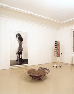 | Nicole Guiraud, Une femme d'Alger, Portrait installation, 1988/89 Kutscher's model-style representations of a portrait subject become involved with the person's own life processes and comment upon them with reference to their societal context. The unified wholeness of a human being is split apart, giving way to heterogeneous, fragmented elements and then reassembled. Nicole Guiraud is a native of Algeria. She lost her left arm in a bomb explosion as a child. This consequence of war, expressed in the form of "a missing piece" is the dominant theme of the entire installation created in 1988/89. A life-sized black-and-white photograph mounted on the wall showed the subject as a nude seen from the rear, seated on a round piano stool, a view familiar in portraiture since Ingres. Her rearward gaze established eye contact with the viewer. A large, shallow bowl made of baked clay was set on the floor in front of the photograph. Kutscher had smashed the bowl prior to the exhibition and reassembled it, leaving out a large piece along the rim. A postcard stand featured cards with two different motifs: the missing piece of the bowl and Delacroix's Femmes d'Alger dans leur apartement, a painting done circa 1847. The missing piece is the shared element that links the parts of the installation. In the photo it is the lost arm, a deformation that is exaggerated by the severe overexposure of the photo. In the smashed and not completely repaired bowl, with the crack lines that remain visible as scars, it is the missing fragment. It is the bowl itself that is missing in the pictures on the postcard stand. It symbolises the political and social consequences of the Algerian war of liberation. In contrast, Delacroix's painting represents a rather misleading positive view of colonialisation. But the yearning for the untainted oriental-exotic life must inevitably be disappointed. This work reflects the romantic view of the exotic, on the one hand, and the violent reality of colonialisation and decolonialisation, on the other. Peter Forster |