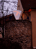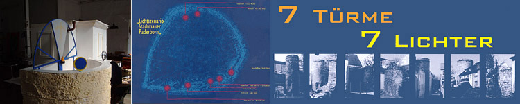 7 Türme - 7 Lichter"Lichtszenario Stadtmauer Paderborn", 4. bis 20. November 2003 Das längerfristige Stadtgestaltungs-Projekt "Lichtszenario" hat die virtuelle Auferstehung der Stadtmauer Paderborns zum Ziel, eines Denkmals der Stadtgeschichte, das - heute weitgehend unsichtbar geworden - mehr und mehr aus der Erinnerung der Bewohner verschwindet. Mit der Bespielung von 7 Turmrelikten durch 7 Lichtinstallationen wird ein erster Akt geschrieben werden, ein Jahr lang aufgeführt von international renommierten Künstlern. Die Künstler: Francois Morellet, Daniel Hausig, Hans-Peter Kuhn, Vollrad Kutscher, Jakob Mattner, Charly Steiger + Achim Wollscheid, Michel Verjux Kurator: Gerhard Auer |
