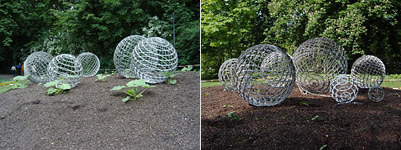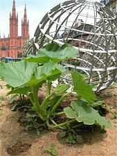 Parkskulptur 2004Vollrad Kutscher veranstaltete von 1980 bis 2000 in seinem Atelier jeweils anlässlich der Frankfurter Buchmesse ein Fest. Das Atelier wurde an diesen Abenden zu einem Knoten im Netzwerk der internationalen Kunst- und Performanceszene. Die Öffnung seines privaten Raumes, die Schaffung einer besonderen Atmosphäre, die den wechselseitigen Austausch zwischen Künstlern der verschiedenen Sparten abseits vom üblichen Kunstmarkt ermöglichte, entsprach seiner künstlerischen Haltung und führte 1982 zum „Erntedankfest“. In einer 7monatigen Aktion hatte er dafür vorher das Atelier in eine Art Gewächshaus verwandelt. Der Treppenaufgang zum Atelier war vollständig bepflanzt. Im Hof wuchsen Kürbisse, Zuchinis und Bohnen, die er im Lauf der Zeit mit erotischen Ritzzeichnungen versah. Sie vernarbten zu eigenartigen Pflanzentatoos. Den Großteil des Atelierbodens bedeckte ein Teppich aus Gras, auf dem ein ebenfalls von einer Grasdecke bewachsener, großer Tisch stand. Zum Erntedankfest wurden darauf u.a. die geernteten, bearbeiteten Kürbisse und Zuchinis präsentiert. Die Besucher waren aufgefordert worden, Gaben für den Erntedanktisch mit zu bringen und erhielten vom Gastgeber signierte Kürbiskerne und Bohnen geschenkt. Kutscher knüpfte an Joseph Beuys Begriff der „Sozialen Plastik“ an. Kunst sollte sich nicht auf rein materielle Artefakte beschränken, sondern über reflektierende Handlungen soziale Konsequenzen mit einbeziehen. Beuys Vorstellungen einer gesellschaftsverändernden Kunst, in der durch menschliches Handeln ein „sozialer Organismus“ entsteht, mündeten bei Kutscher im spielerischen Ritual eines erotischen „Erntedankfestes“ ,das über den Rückgriff auf kirchliche Traditionen hinaus selbst wiederum auf rauschende Feste bäuerlich- archaischer Gesellschaften verwies. Seine Arbeit erinnerte daran, dass unsere heutige städtische Kultur aus den Eingriffen unserer sesshaft gewordenen Vorfahren in Natur, der Agrikultur hervorgegangen ist. „Skulptur 2004“ im künstlich angelegten Wiesbadener Kurpark verlagert den damals, in einer Zeit der zunehmenden Bewusstwerdung ökologischer Probleme, im privaten Raum veranstalteten Ansatz auf die Beantwortung der Frage, wie im 21. Jhd. eine Skulptur im öffentlichen Raum aussehen könnte. Auf einer Parkwiese befindet sich ein kreisrunder Humushaufen, der sowohl als Sockel für Gitter-Weltkugeln aus Edelstahl als auch als Anbaufläche für Kürbispflanzen dient. Die in ihrer Größe divergierenden Kugeln lassen in Anzahl und Auslegung an ein Planetensystem denken. Sie sindzwar aufklappbar, bleiben aber verschlossen und sind mit Ketten untereinander verbunden. Innerhalb dieser „Welten-Körper“ entwickeln sich über einen Sommer hinweg aus den zarten Pflanzen die Kürbisse. Wie ein Schutz vor Diebstahl legen sich die Kugel zunächst behütend um die Kürbisse, doch werden einige bedingt durch ihr natürliches Wachstum an ihre Käfiggrenzen stoßen. “Wird das Gitter den Kürbis erdrücken, wird er verschimmeln oder wird er in das Gitter hineinwachsen und es nach innen schlucken?“. Das von Kutscher inszenierte Drama zwischen geometrischer und organischer Form, zwischen hartem Metall und weicher Frucht, zwischen Kultur und Natur steht als Metapher für allgemeine gesellschaftliche und individuelle Entwicklungsprozesse. Als zusätzlicher Aspekt sollten ursprünglich Kameras die Arbeit überwachen und dokumentieren. Diese Skulptur bedarf, anders wie traditionelle Werke, aber genauso wie der Park, steter Pflege und Kultivierung, aber ein solch lebendiger Umgang mit ihr könnte zu einer lustvollen Erntedanktradition werden. Wenn im Herbst die Kugeln geöffnet und die Kürbisse geerntet werden, dann hat das Publikum die Möglichkeit die Arbeit neu zu verinnerlichen, denn neben die Augenfreuden treten dann auch die Gaumenfreuden. Peter Forster |