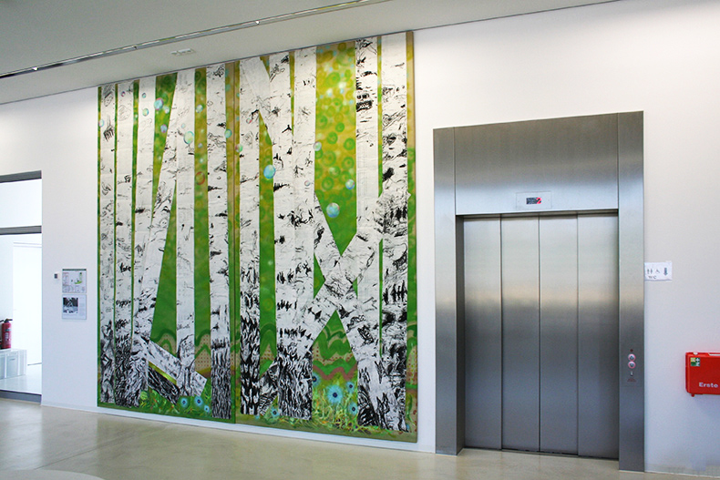 | Pionierwald – Vollrad Kutscher, 2018, 3,90 m x 4,00 m, Leinwand, Papierstreifen von 1979/85, Ölkreide, Acryl Eingangsbereich des Ernst Strüngmann Institute (ESI) for Neurosience, Frankfurt |