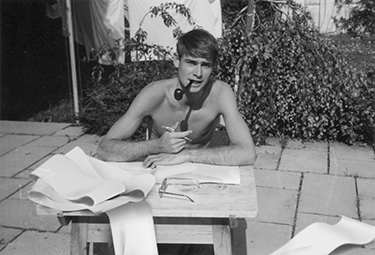 Mann mit Pfeife – Francine Singer, Fotografie, 70er JahreDas Foto aus dem Familienalbum von Francine Singer zeigt Wolf Singer, seit 1980 Direktor am MPI als jungen Mann beim Studium ebensolcher Papierstreifen im elterlichen Garten. Er scheint den Schatten der Pfeife auf seiner Brust greifen zu wollen. Aber wonach greift er eigentlich? Nach der Pfeife, ihrem Schatten, der nächsten Formulierung oder ruht die Hand mit dem Schreibwerkzeug nur aus, während er kurz von der Durchsicht der wissenschaftlichen Informationen auf den Papierbahnen zur Fotografin aufschaut? |