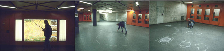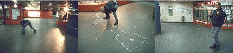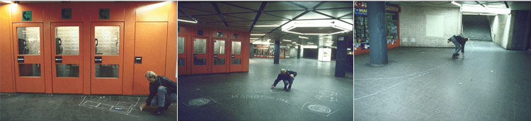| ERSATZPALAST I & II, 1986, Frankfurt am Main V. Kutscher mit Koffer und Transistorradio, weißer Kreide und verschiedenen Utensilien, Dauer der Performance: 1 Stunde, Dauer des Videos: 20 Minuten |